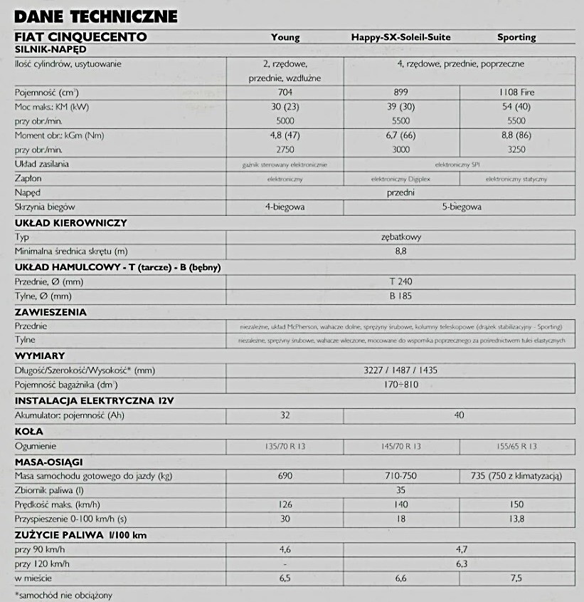W latach 1995–1996 produkt fabryki w Tychach sprzedawał się w bardzo zbliżonej liczbie – 51 845 szt. (1995) i 51 711 sztuk (1996). Dodatkowo na rynek trafiło 995 egzemplarzy (1995) i 7016 (1996) Cinquecento Van. Dostawcza wersja była dostępna z dwoma silnikami: 700 i 900. Przedsiębiorcy potrzebujący niewielkiego środka transportu chętniej decydowali się na mniejsze źródło napędu. Po denominacji złotego przestano w Polsce podczas zwykłych operacji pieniężnych płacić tysiącami, a nawet milionami. Znaczącemu skróceniu uległy ceny produktów. W nowych warunkach Cinquecento wyceniono na 13 667 nowych złotych za 700-tkę, 16 262 zł za 900-tkę i 19 905 zł za odmianę Sporting. Ze względu na cenę polscy klienci wybierali głównie tańsze wersje z podstawowym silnikiem 0.7. Mimo to włoski koncern również na nasz rynek wprowadzał droższe i lepiej wyposażone odmiany. W lipcu 1995 roku Cinquecento SX oraz Suite, a lutym następnego roku zaprezentowano Soleil (słońce) z otwieranym materiałowym dachem (silnik 0.9). W 1996 roku ceny znacząco wzrosły. Najtańszy wariant oferowano za 17 445 zł, 900-tkę – 19 875 zł, Sporting – 21 539 zł, a odmiany SX i Suite za odpowiednio za 20 500 i 22 759 zł.